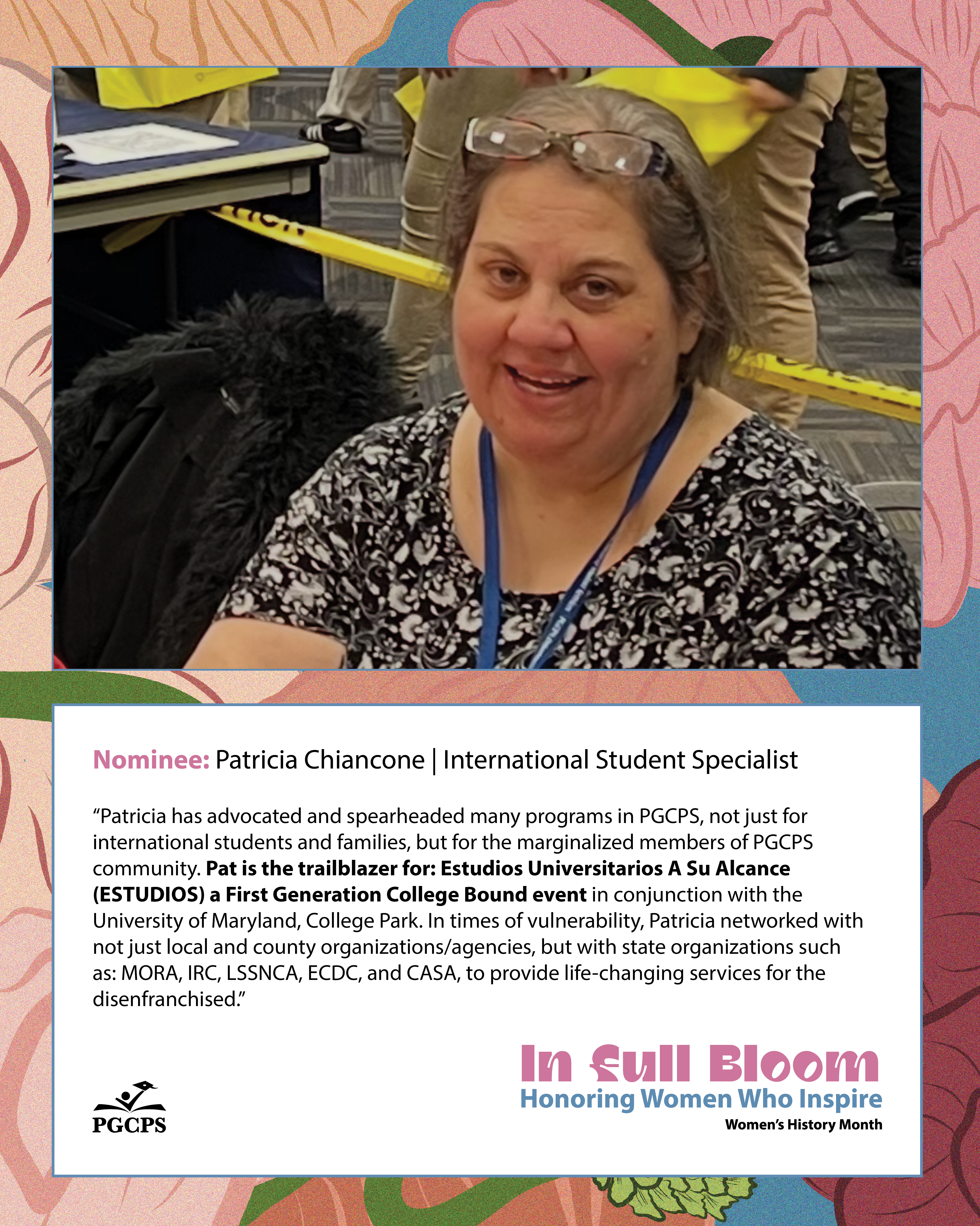 “Patricia has advocated and spearheaded many programs in PGCPS, not just for international students and families, but for the marginalized members of PGCPS community. Pat is the trailblazer for: Estudios Universitarios A Su Alcance (ESTUDIOS) a First Generation College Bound event in conjunction with the University of Maryland, College Park. In times of vulnerability, Patricia networked with not just local and county organizations/agencies, but with state organizations such as: MORA, IRC, LSSNCA, ECDC, and CASA, to provide life-changing services for the disenfranchised.”