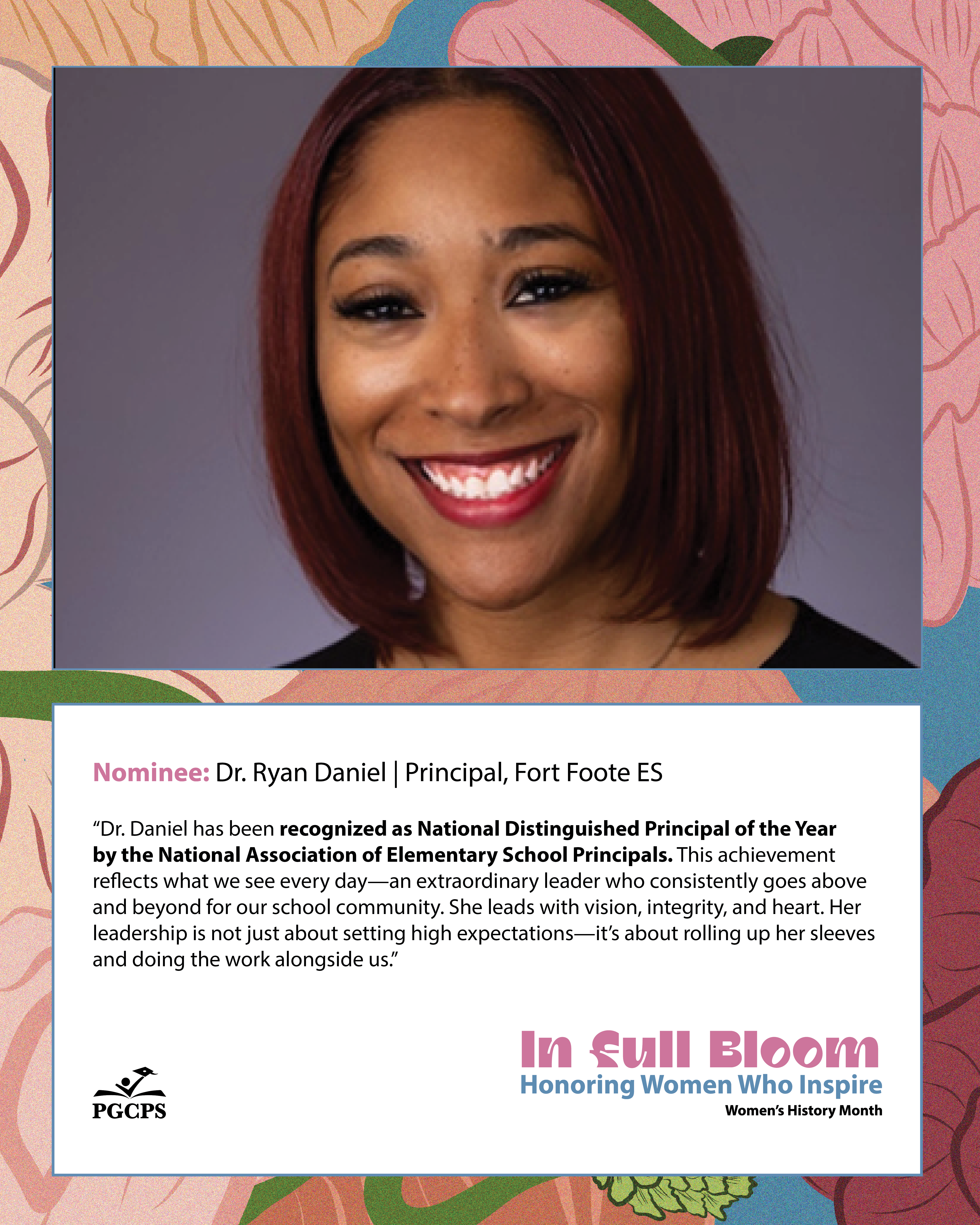 “Dr. Daniel has been recognized as National Distinguished Principal of the Year by the National Association of Elementary School Principals. This achievement reflects what we see every day—an extraordinary leader who consistently goes above and beyond for our school community. She leads with vision, integrity, and heart. Her leadership is not just about setting high expectations—it’s about rolling up her sleeves and doing the work alongside us.”