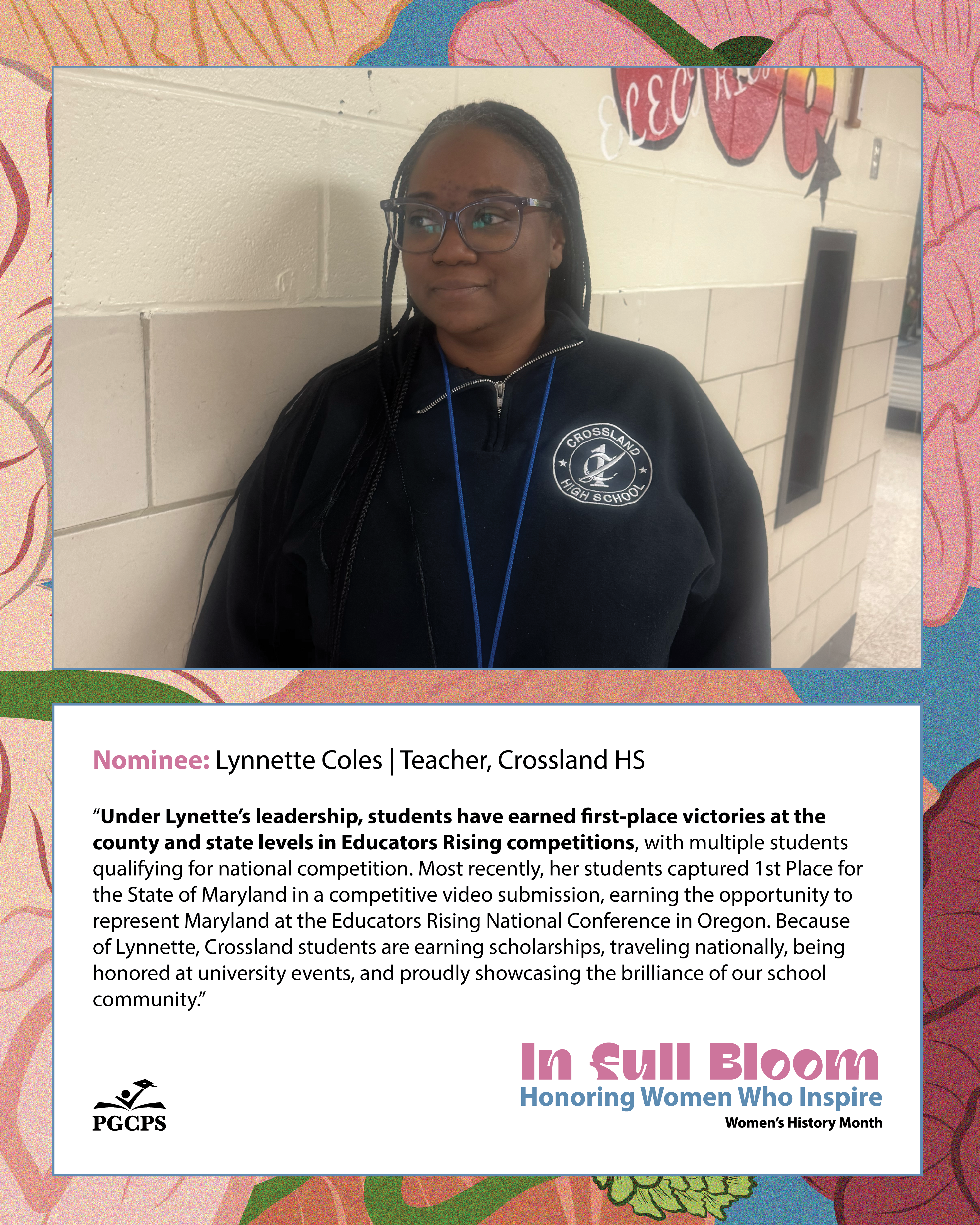 “Under Lynette’s leadership, students have earned first-place victories at the county and state levels in Educators Rising competitions, with multiple students qualifying for national competition. Most recently, her students captured 1st Place for the State of Maryland in a competitive video submission, earning the opportunity to represent Maryland at the Educators Rising National Conference in Oregon. Because of Lynnette, Crossland students are earning scholarships, traveling nationally, being honored at university events, and proudly showcasing the brilliance of our school community.”