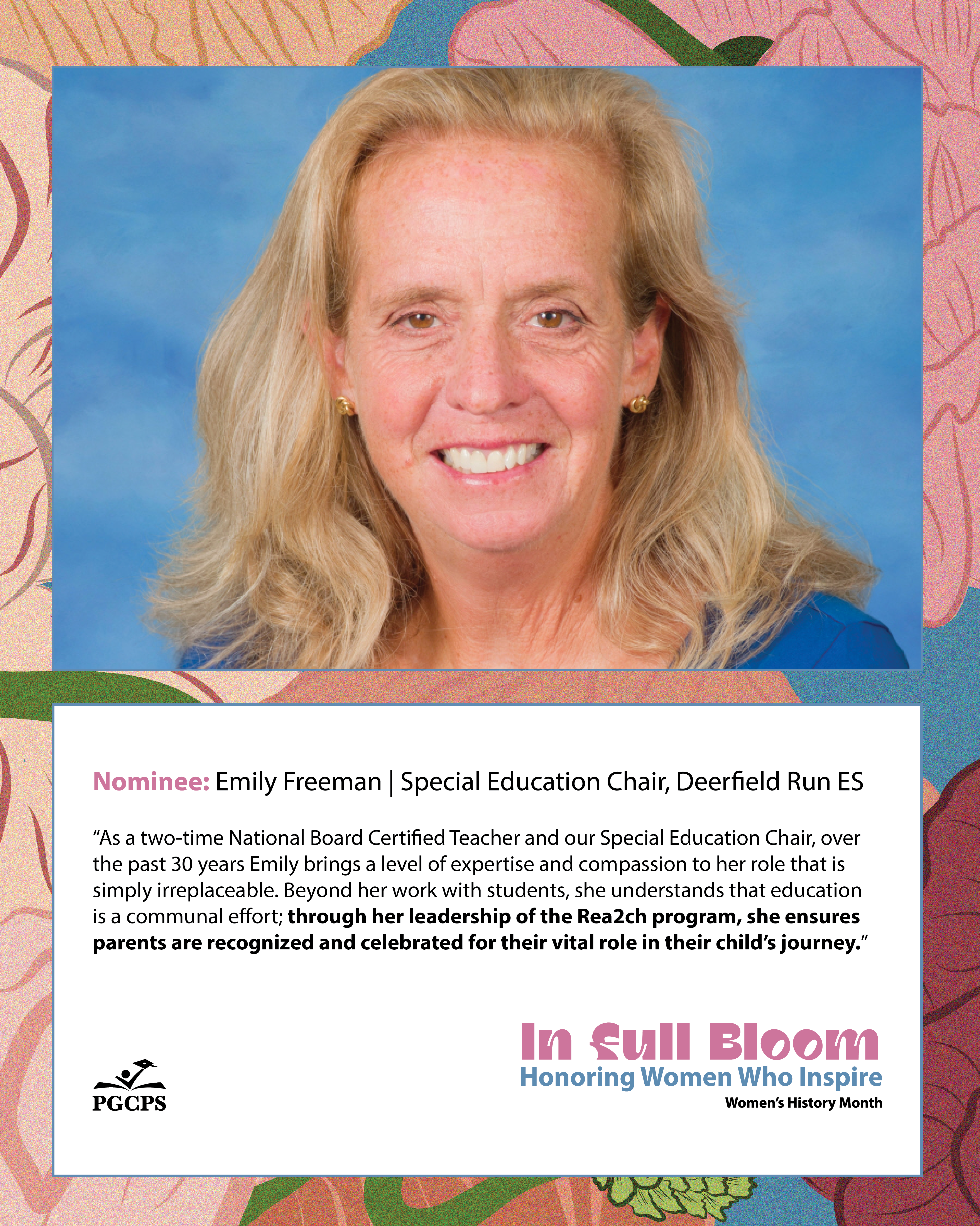 “As a two-time National Board Certified Teacher and our Special Education Chair, over the past 30 years Emily brings a level of expertise and compassion to her role that is simply irreplaceable. Beyond her work with students, she understands that education is a communal effort; through her leadership of the Rea2ch program, she ensures parents are recognized and celebrated for their vital role in their child’s journey.”