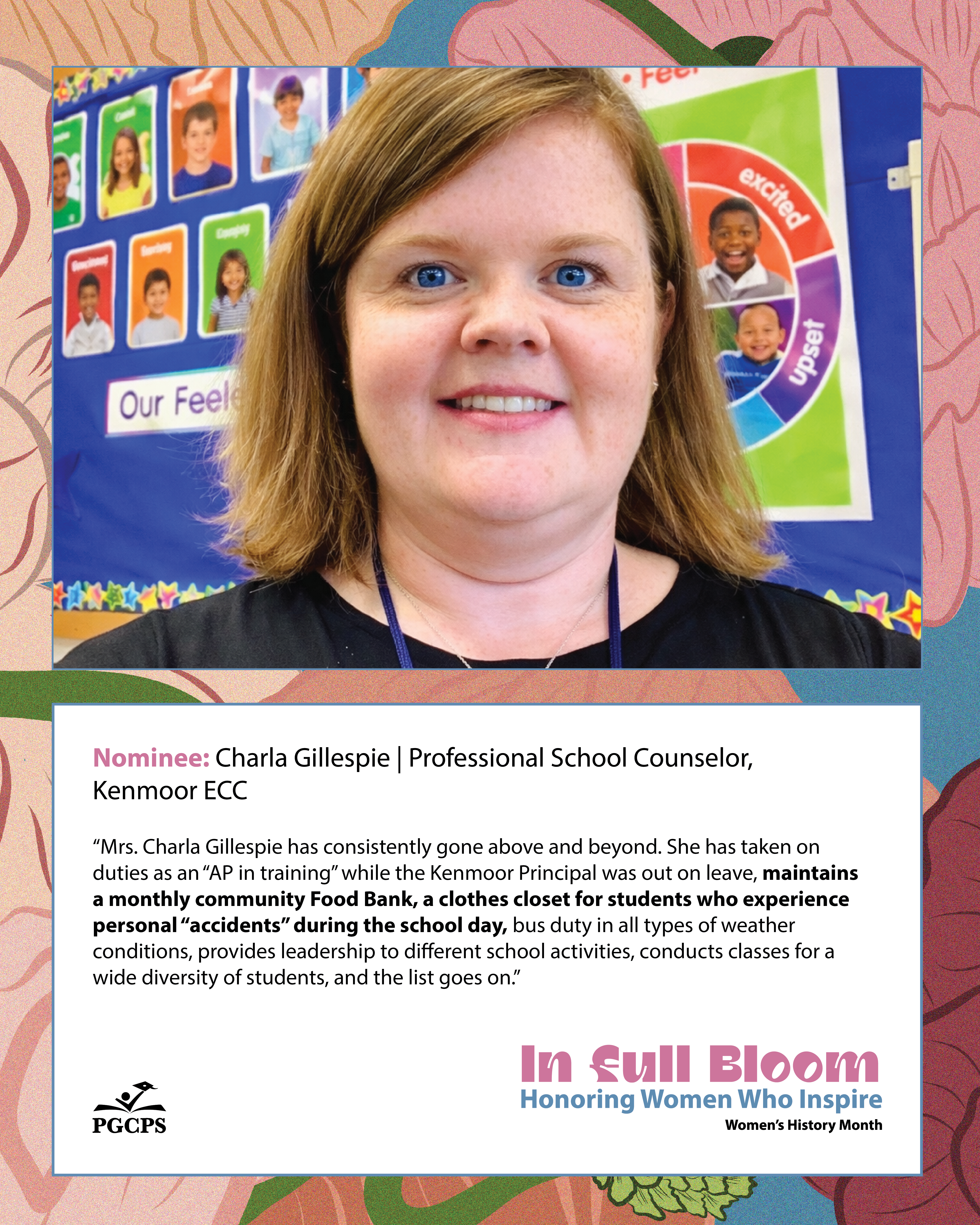 “Mrs. Charla Gillespie has consistently gone above and beyond. She has taken on duties as an “AP in training” while the Kenmoor Principal was out on leave, maintains a monthly community Food Bank, a clothes closet for students who experience personal “accidents” during the school day, bus duty in all types of weather conditions, provides leadership to different school activities, conducts classes for a wide diversity of students, and the list goes on.”