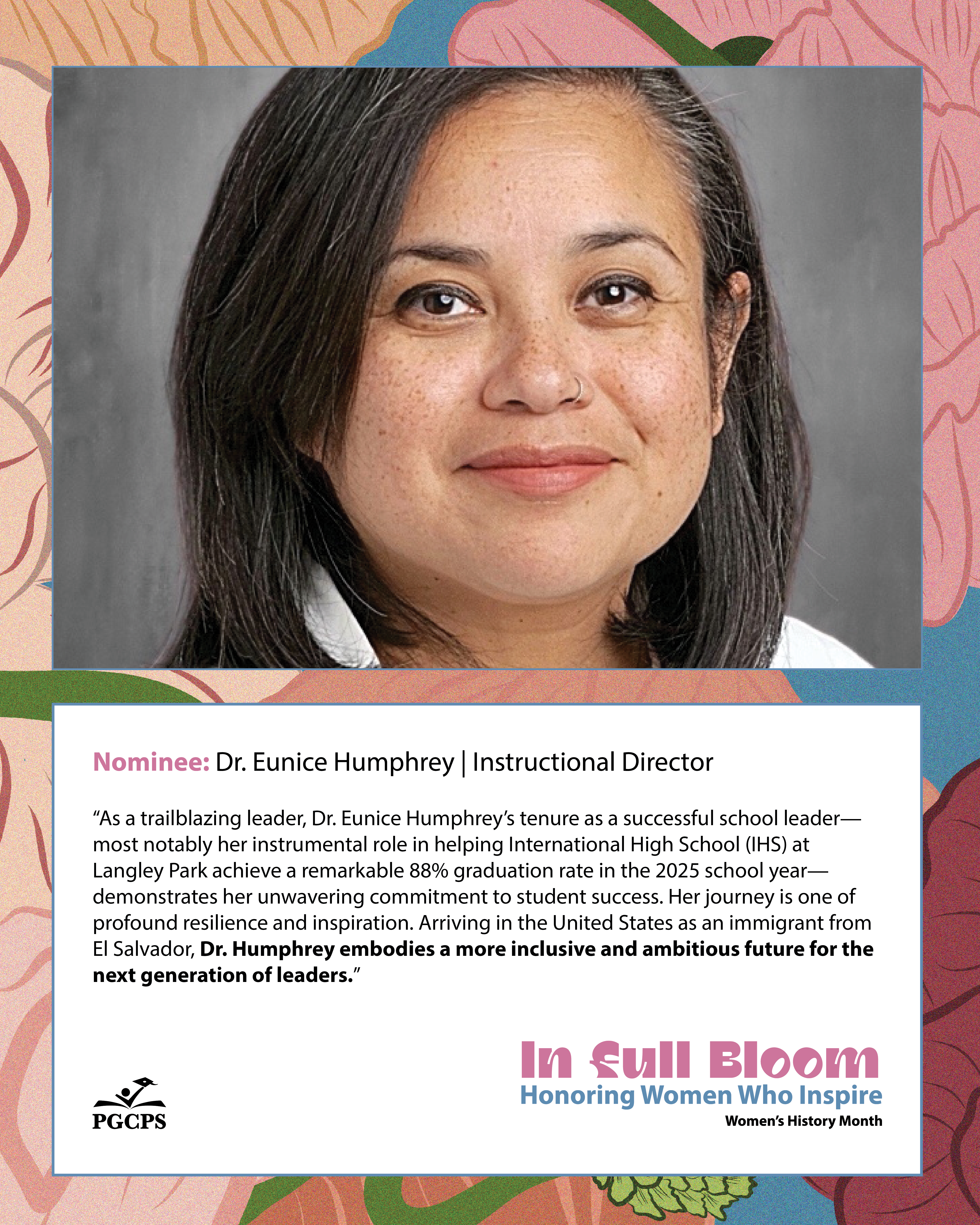 “As a trailblazing leader, Dr. Eunice Humphrey’s tenure as a successful school leader—most notably her instrumental role in helping International High School (IHS) at Langley Park achieve a remarkable 88% graduation rate in the 2025 school year—demonstrates her unwavering commitment to student success. Her journey is one of profound resilience and inspiration. Arriving in the United States as an immigrant from El Salvador, Dr. Humphrey embodies a more inclusive and ambitious future for the next generation of leaders.”