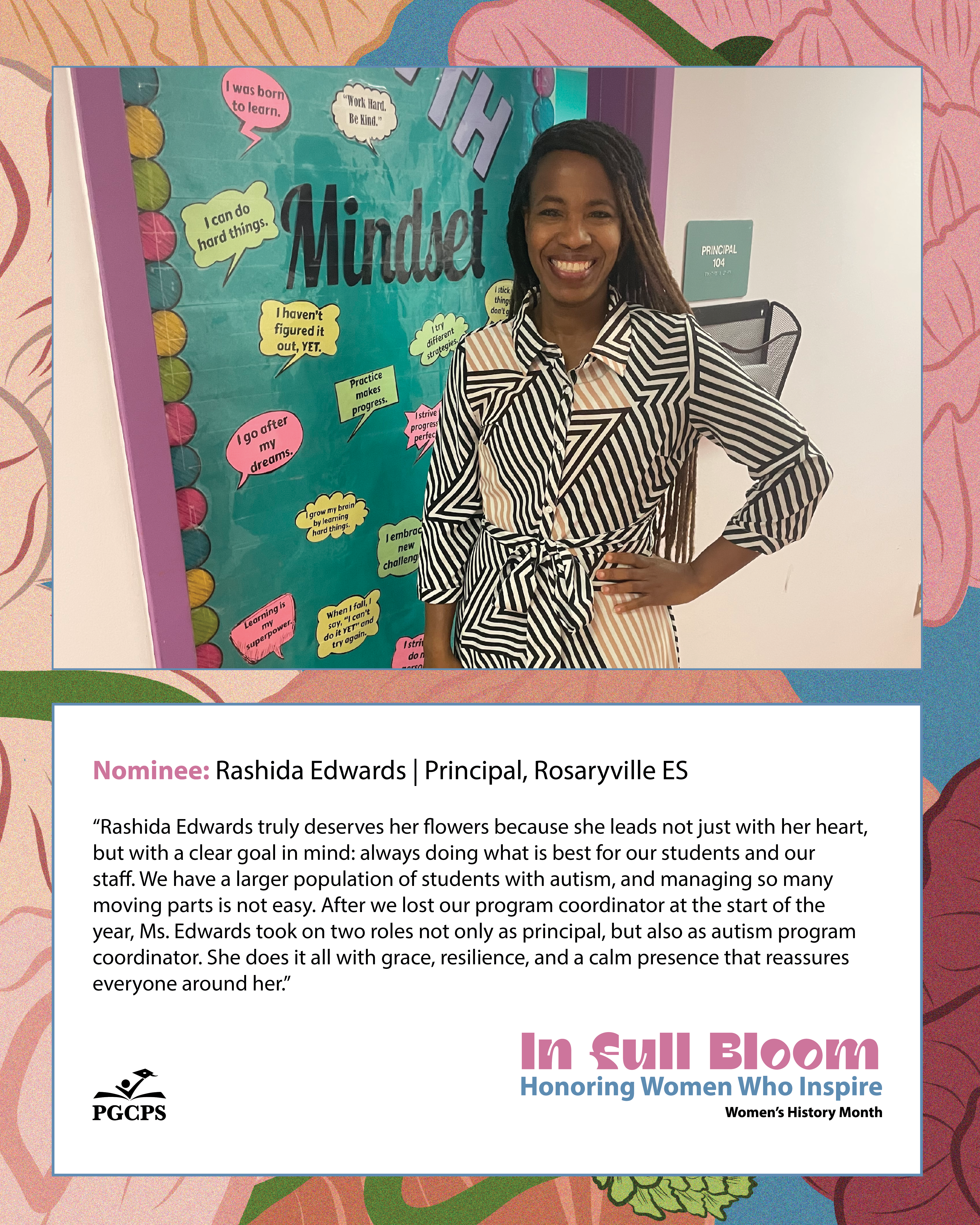 “Rashida Edwards truly deserves her flowers because she leads not just with her heart, but with a clear goal in mind: always doing what is best for our students and our staff. We have a larger population of students with autism, and managing so many moving parts is not easy. After we lost our program coordinator at the start of the year, Ms. Edwards took on two roles not only as principal, but also as autism program coordinator. She does it all with grace, resilience, and a calm presence that reassures everyone around her.”