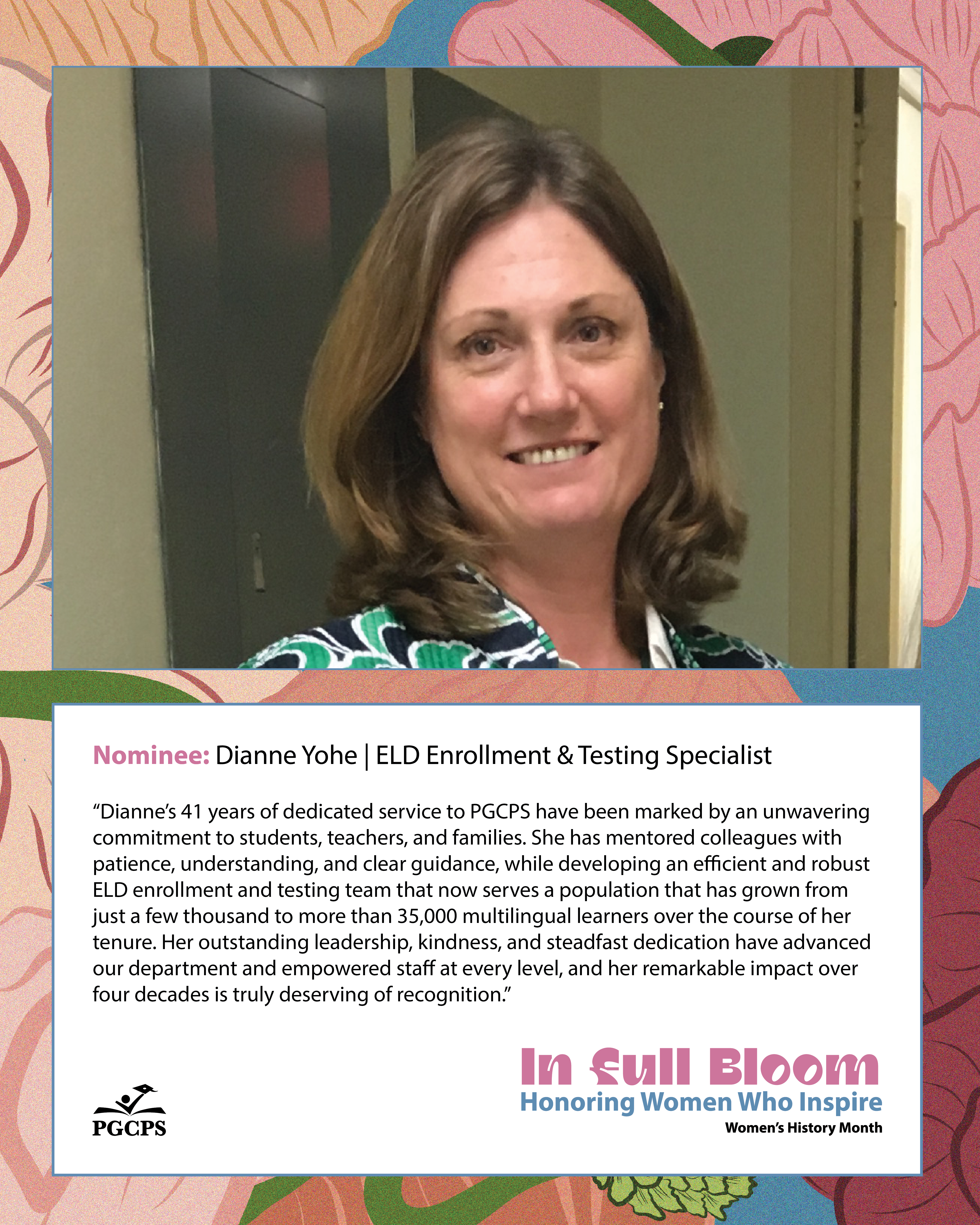 “Dianne’s 41 years of dedicated service to PGCPS have been marked by an unwavering commitment to students, teachers, and families. She has mentored colleagues with patience, understanding, and clear guidance, while developing an efficient and robust ELD enrollment and testing team that now serves a population that has grown from just a few thousand to more than 35,000 multilingual learners over the course of her tenure. Her outstanding leadership, kindness, and steadfast dedication have advanced our department and empowered staff at every level, and her remarkable impact over four decades is truly deserving of recognition.”