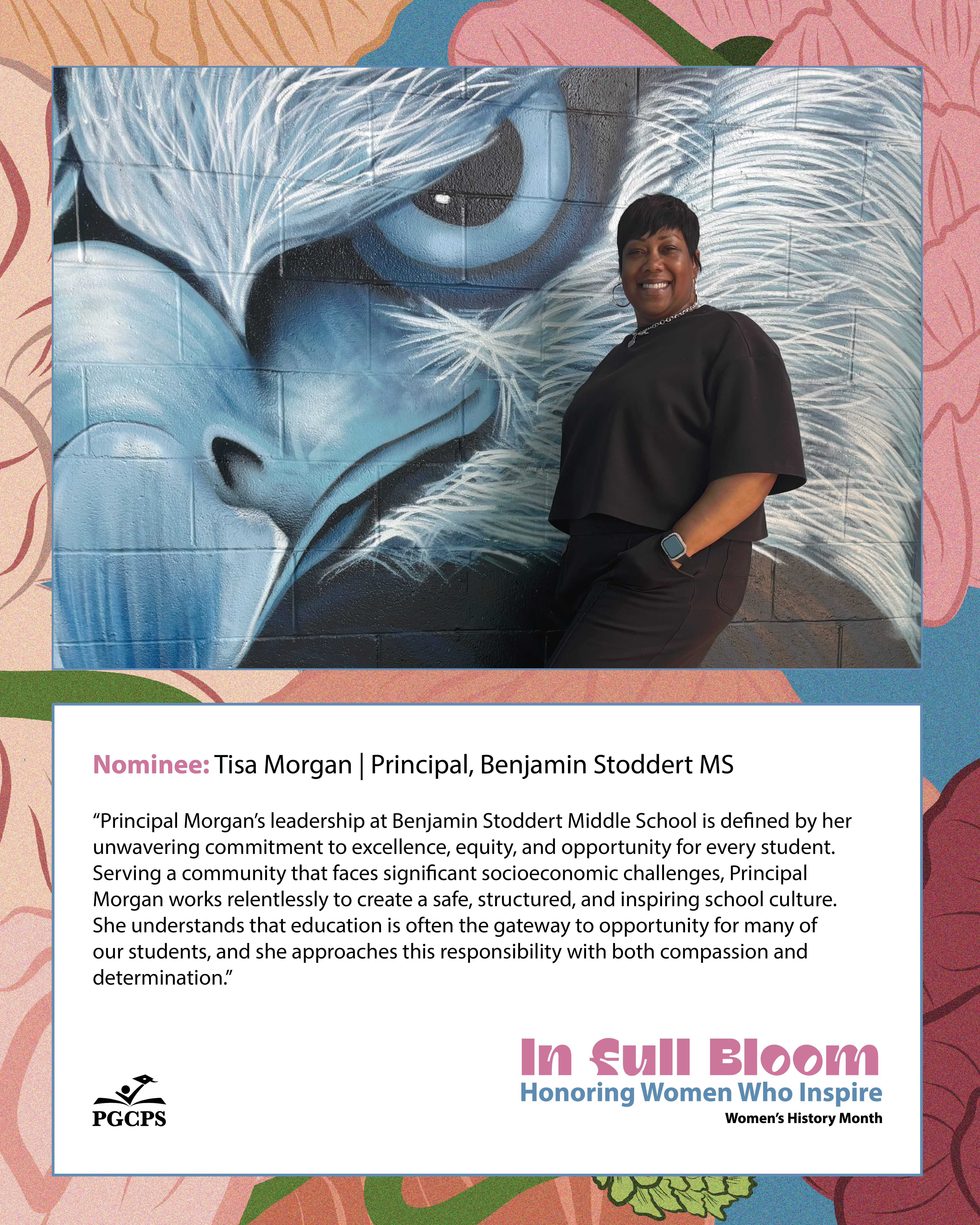 “Principal Morgan’s leadership at Benjamin Stoddert Middle School is defined by her unwavering commitment to excellence, equity, and opportunity for every student. Serving a community that faces significant socioeconomic challenges, Principal Morgan works relentlessly to create a safe, structured, and inspiring school culture. She understands that education is often the gateway to opportunity for many of our students, and she approaches this responsibility with both compassion and determination.”