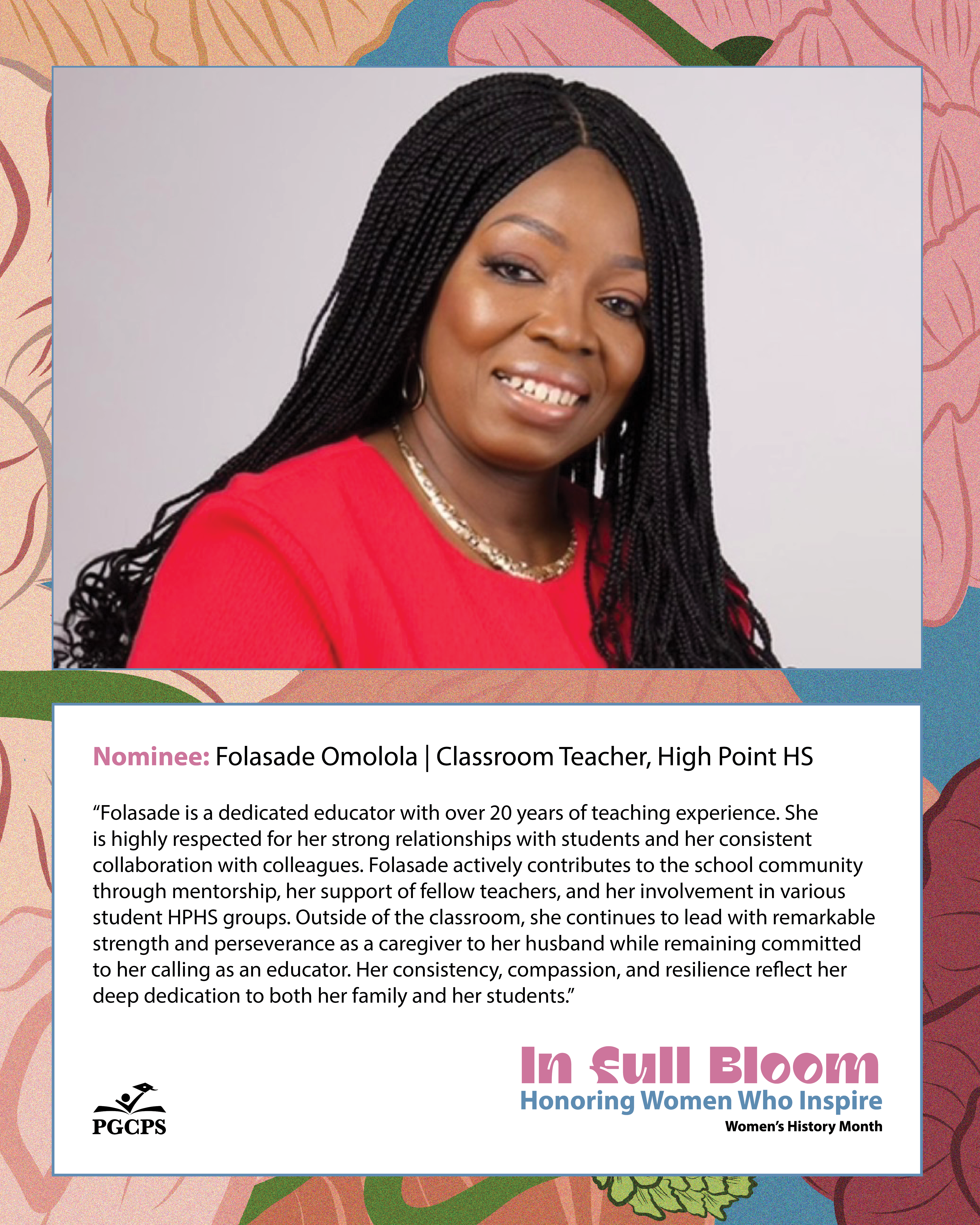 “Folasade is a dedicated educator with over 20 years of teaching experience. She is highly respected for her strong relationships with students and her consistent collaboration with colleagues. Folasade actively contributes to the school community through mentorship, her support of fellow teachers, and her involvement in various student HPHS groups. Outside of the classroom, she continues to lead with remarkable strength and perseverance as a caregiver to her husband while remaining committed to her calling as an educator. Her consistency, compassion, and resilience reflect her deep dedication to both her family and her students.”