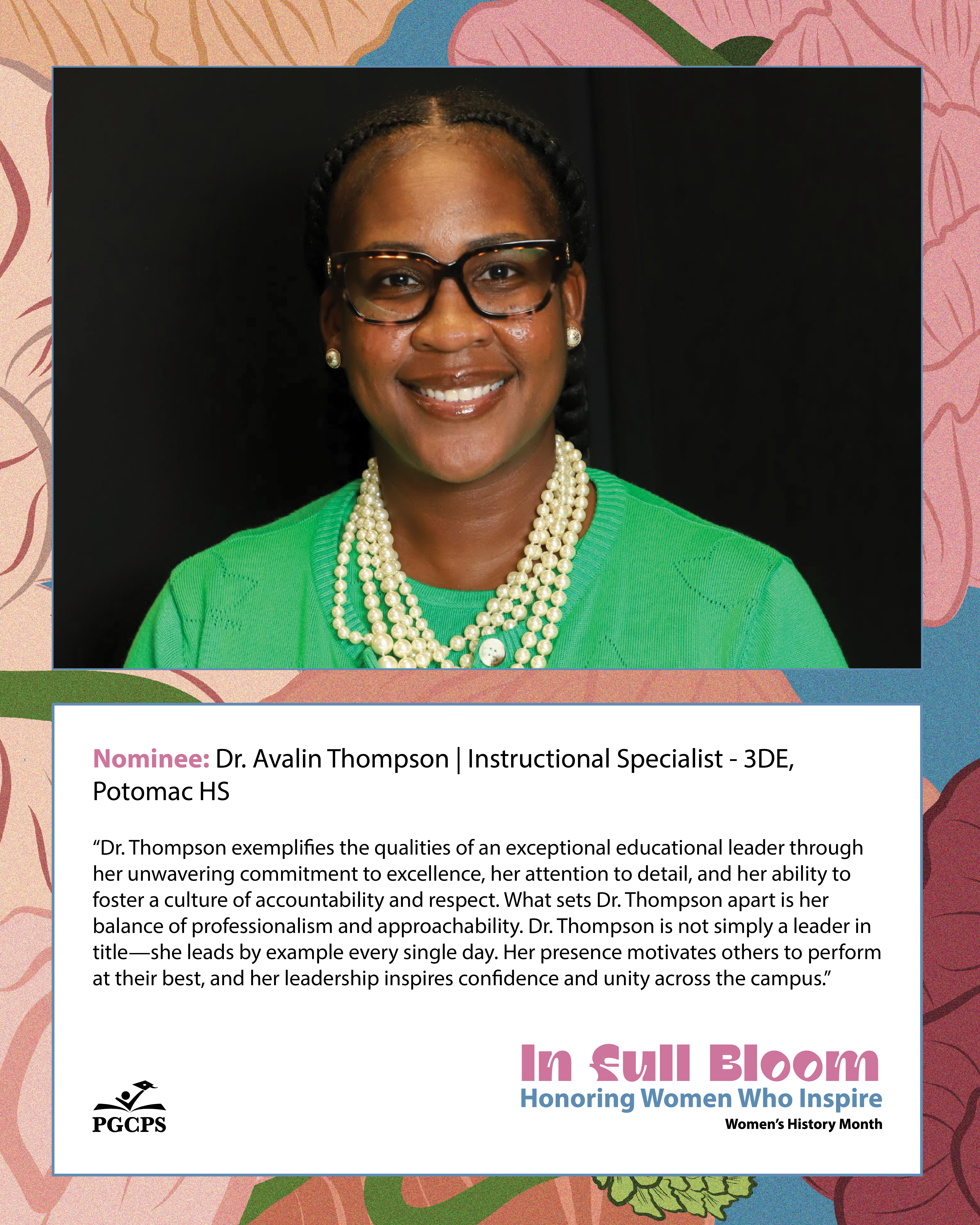 “Dr. Thompson exemplifies the qualities of an exceptional educational leader through her unwavering commitment to excellence, her attention to detail, and her ability to foster a culture of accountability and respect. What sets Dr. Thompson apart is her balance of professionalism and approachability. Dr. Thompson is not simply a leader in title—she leads by example every single day. Her presence motivates others to perform at their best, and her leadership inspires confidence and unity across the campus.”