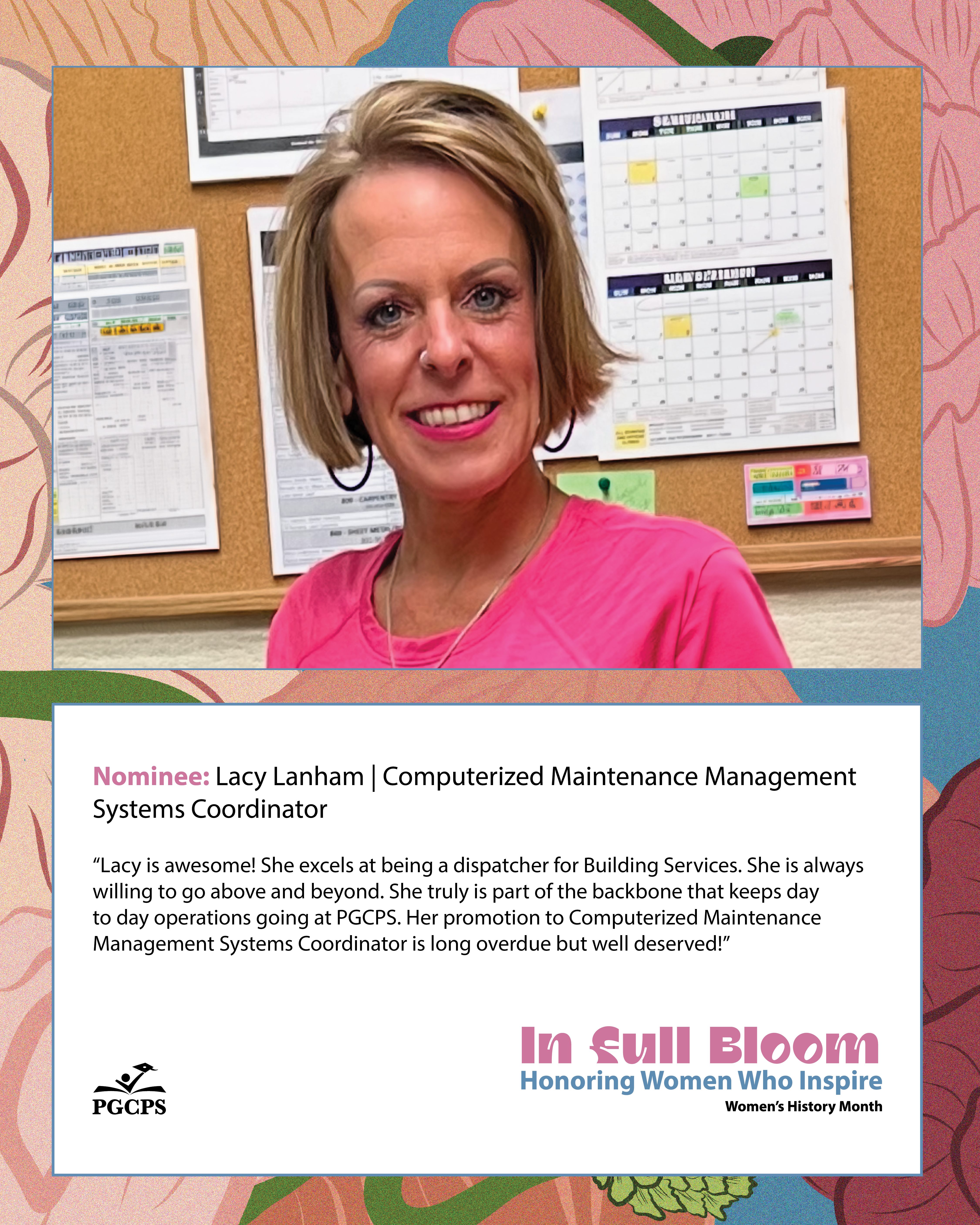 “Lacy is awesome! She excels at being a dispatcher for Building Services. She is always willing to go above and beyond. She truly is part of the backbone that keeps day to day operations going at PGCPS. Her promotion to Computerized Maintenance Management Systems Coordinator is long overdue but well deserved!”