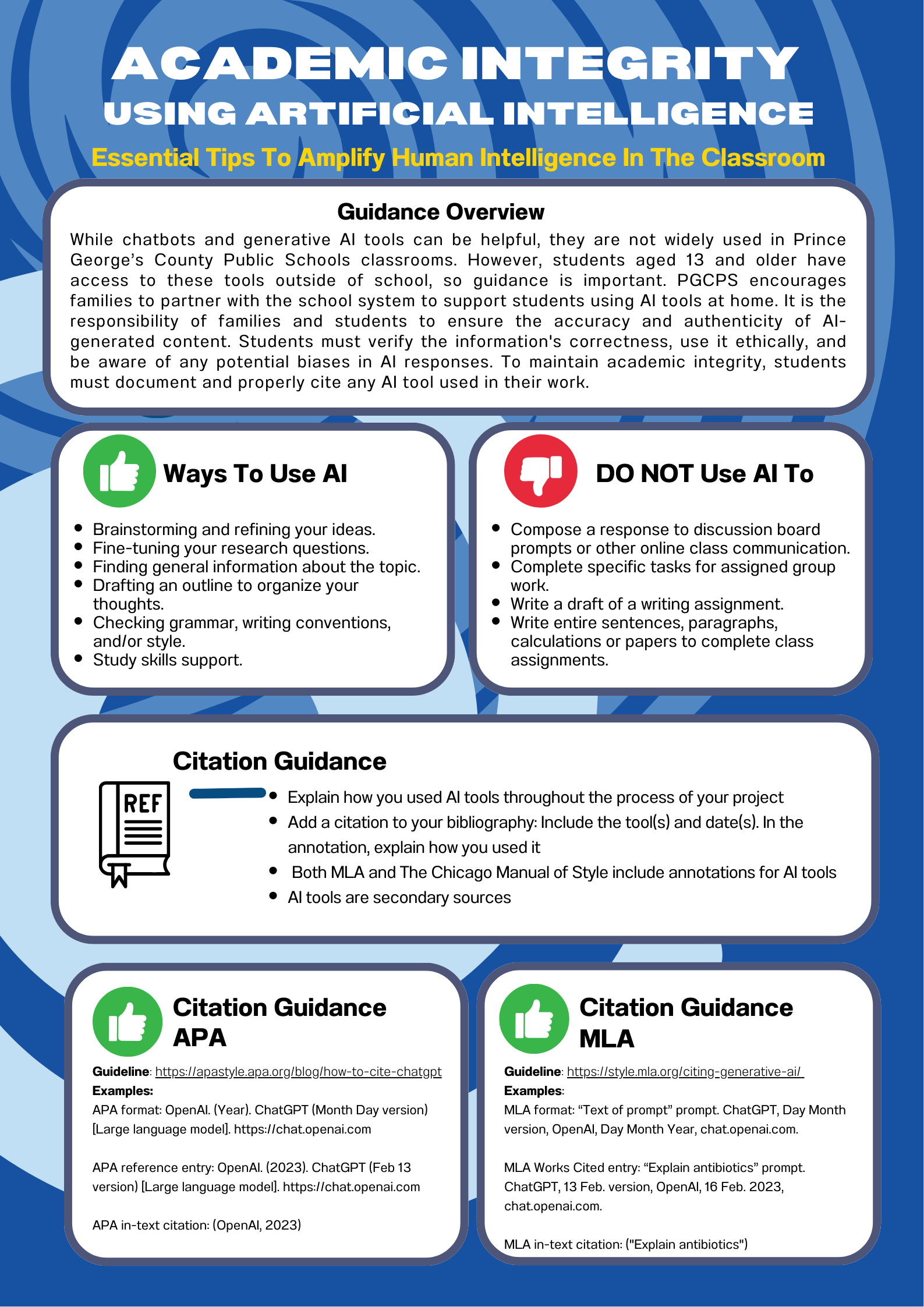 While chatbots and generative AI tools can be helpful, they are not widely used in Prince George’s County Public Schools classrooms. However, students aged 13 and older have access to these tools outside of school, so guidance is important. PGCPS encourages families to partner with the school system to support students using AI tools at home. It is the responsibility of families and students to ensure the accuracy and authenticity of AI-generated content. Students must verify the information's correctness, use it ethically, and be aware of any potential biases in AI responses. To maintain academic integrity, students must document and properly cite any AI tool used in their work.