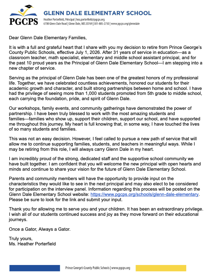 Our beloved principal, Ms. Porterfield, is retiring after 31 years in education. She is excited for her new adventures to come. Please read her letter to the community.
